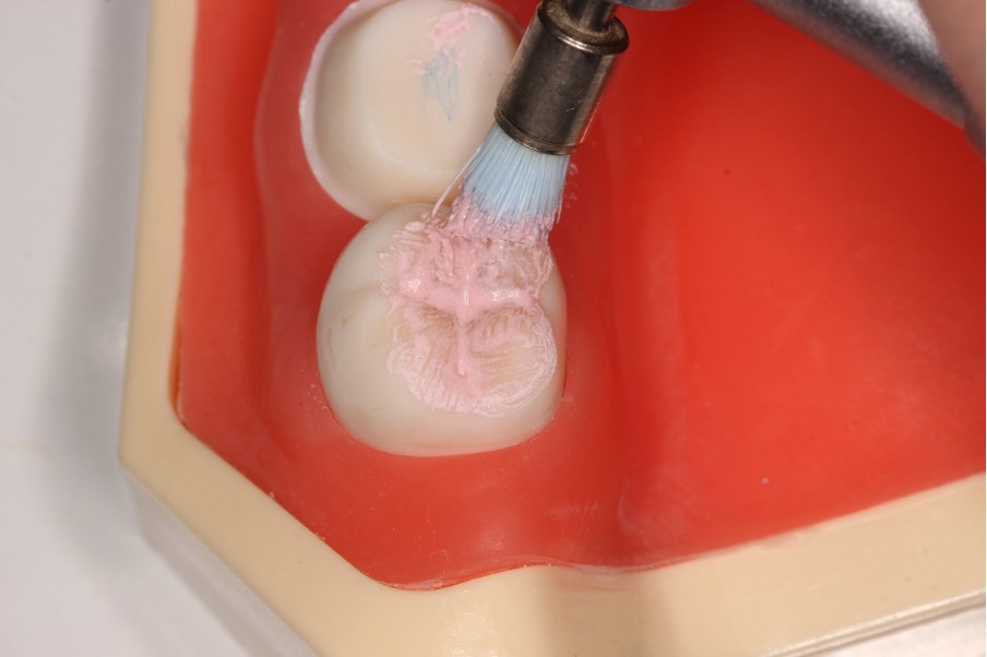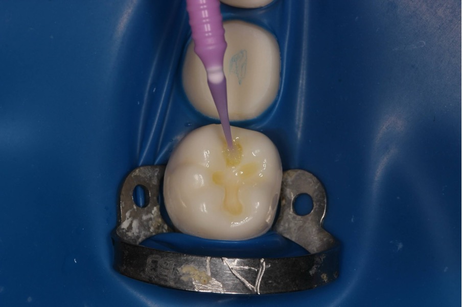 На ткани зуба наносится кислотосодержащий гель (протравка), протравка помогает удалить смазанный слой (остатки ораганических веществ ,которые могут снизить адгезию)