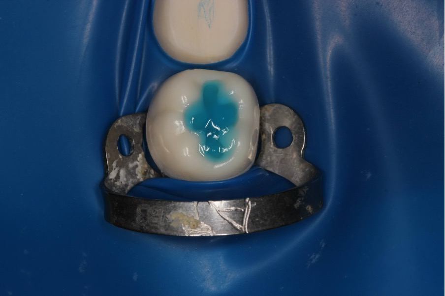 Здоровые ткани зуба изолируются от слюны с помощью специального платка — коффердама, что создает стерильные условия для работы.
